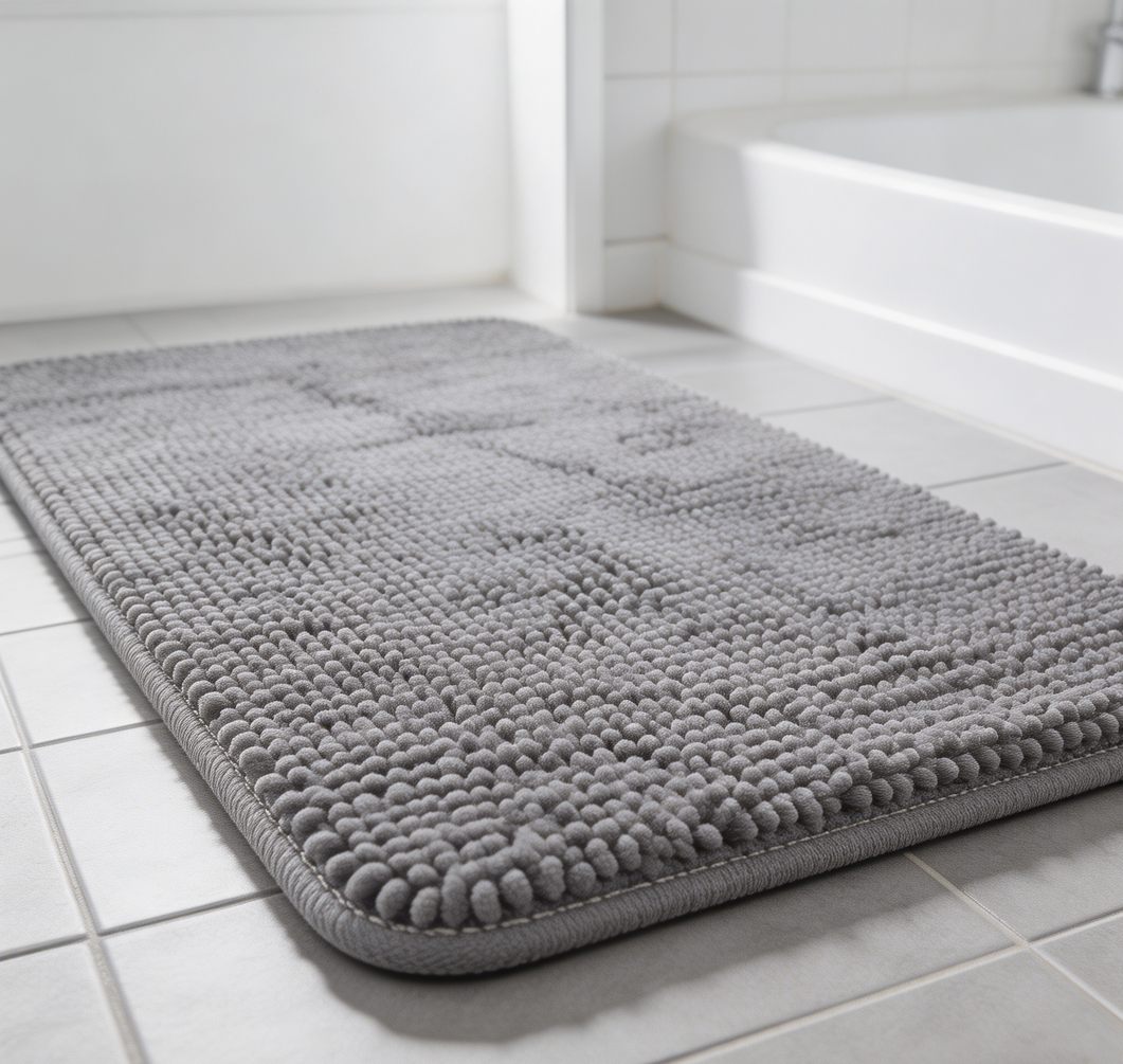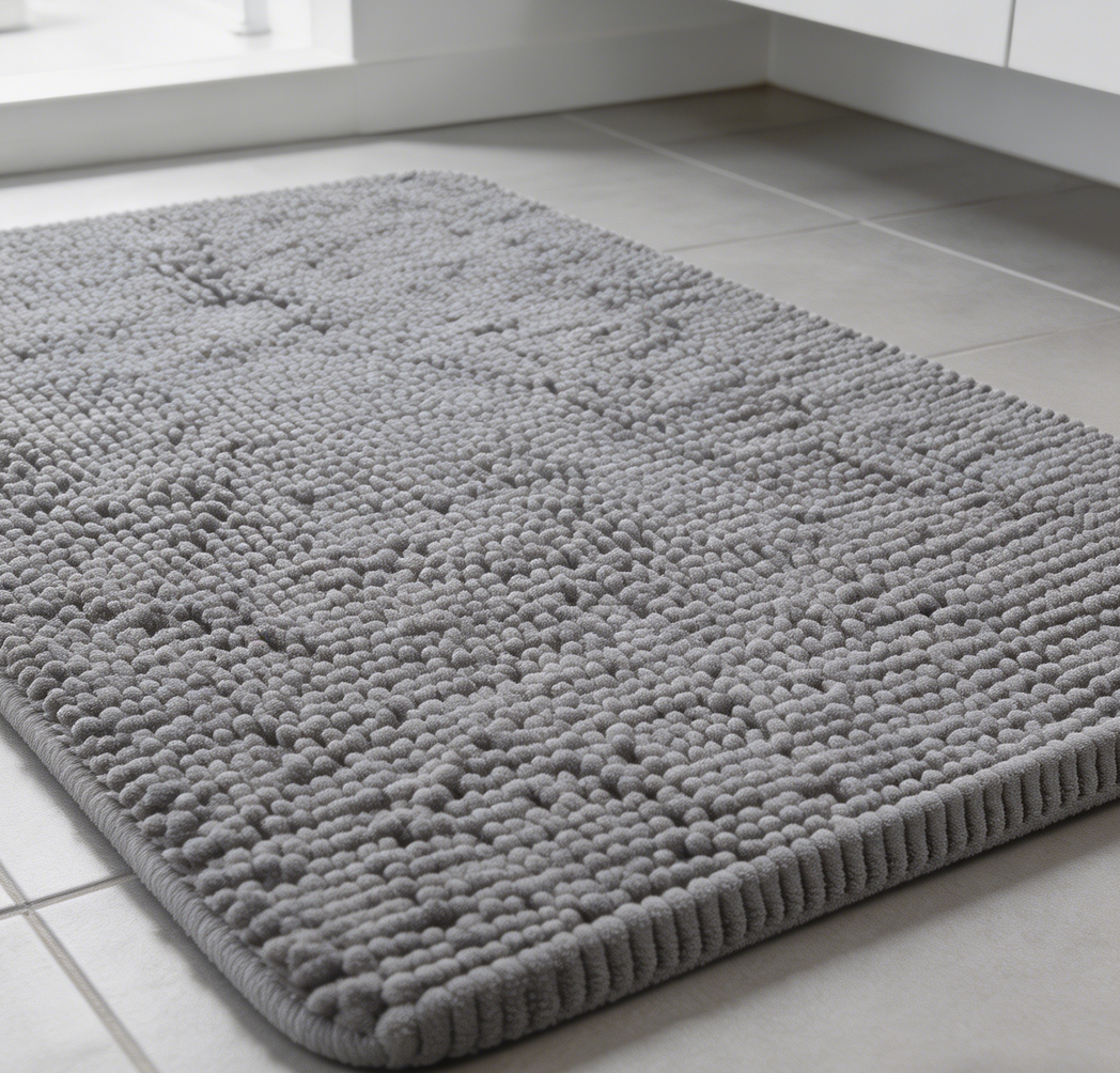 The underside of the mat is finished with a rubber backing that provides grip on bathroom floors. This backing helps the mat stay in place during use, reducing the tendency to slide or bunch up underfoot. It is important to place the mat on a dry, clean floor to allow the rubber to grip properly, as wet or dusty surfaces can diminish its effectiveness. The mat is also described as quick‑dry, meaning that the chenille fibres release moisture relatively rapidly once the mat is hung or laid flat in a ventilated area. This helps the mat stay fresh and ready for reuse sooner than some thicker fabric mats.